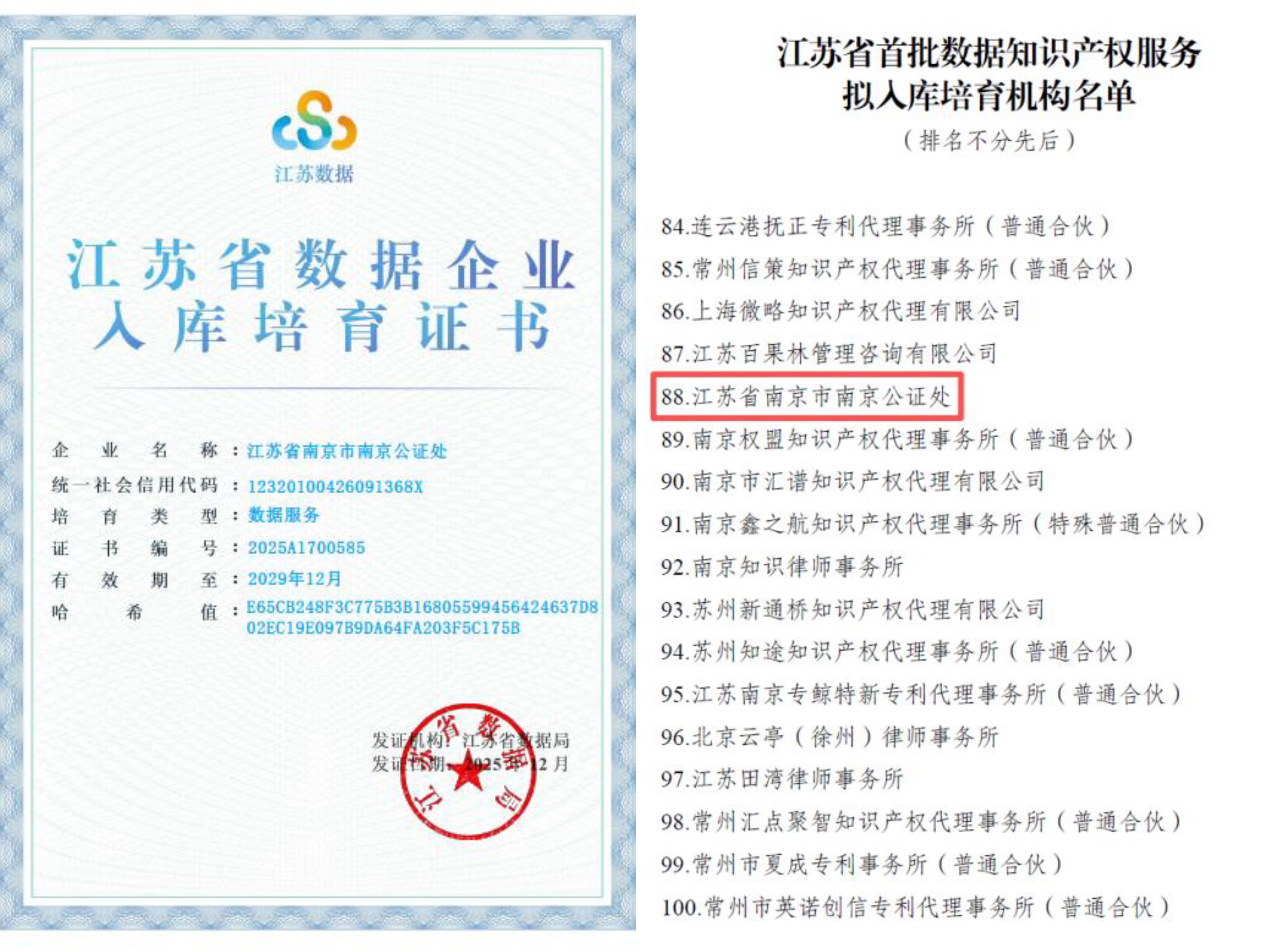 近日,江苏省数据局和江苏省知识产权局分别公布了首批《江苏省入库培育数据企业名单》以及《江苏省首批数据知识产权服务拟入库培育机构名单》,南京公证处入选两家培育库。