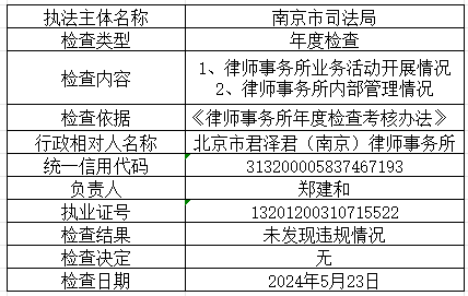 南京市司法局对北京市君泽君(南京)律师事务所行政检查